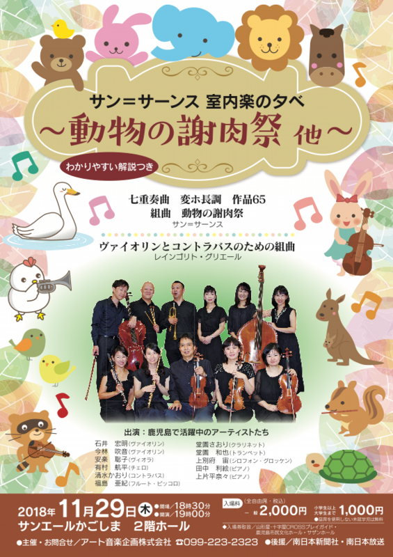 | 出演 | 鹿児島で活躍中のアーティストたち 石井 宏明(ヴァイオリン) 今林 吹音(ヴァイオリン) 安楽 聡子(ヴィオラ) 有村 航平(チェロ) 清水かおり(コントラバス) 福島 亜紀(フルート・ピッコロ)) 堂園 さおり(クラリネット) 堂園 和也(トランペット) 上別府 宙(シロフォン・グロッケン) 田中 利絵(ピアノ) 上片平 奈々(ピアノ) |